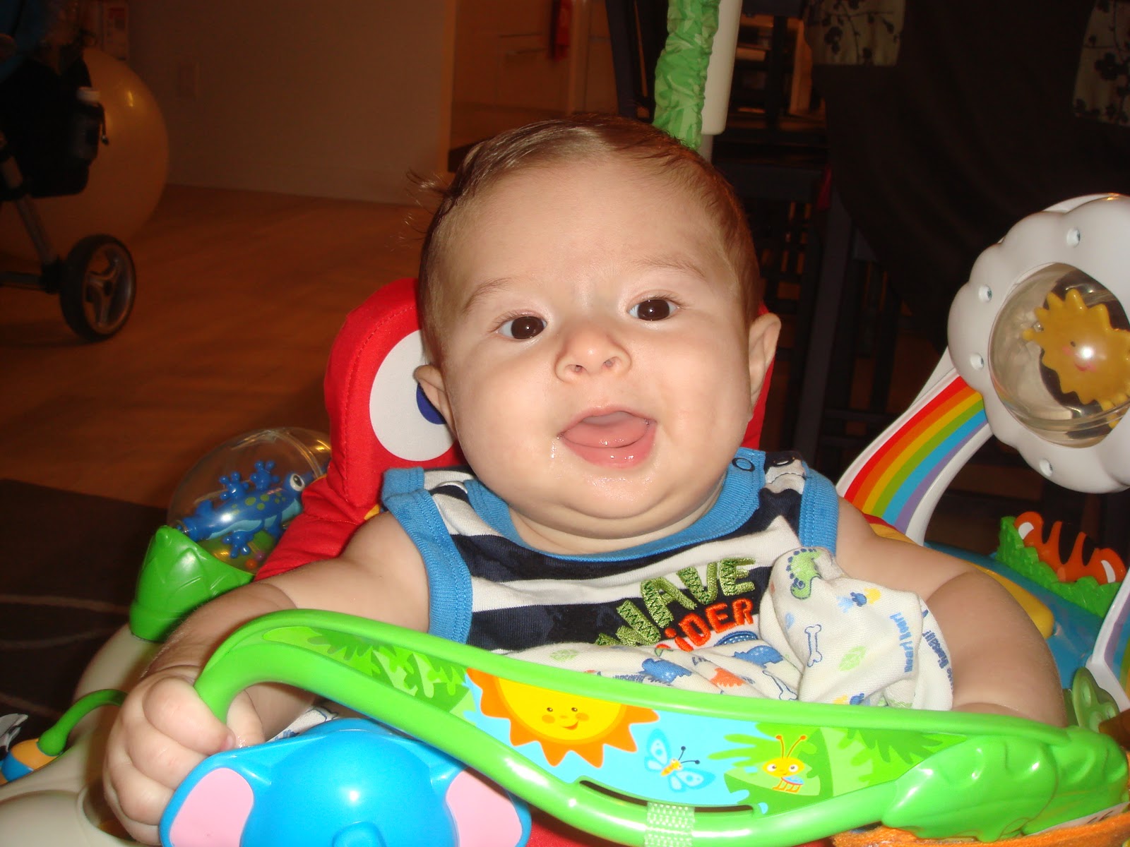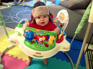 This is me in my jumperoo, otherwise known in our household as the corporate jet... I just love jumping around in this thing. I am quite good at it. Can't go wrong here... can, however, get overstimulated, but my parents think this is a good thing because it means that I may be ready for a nap afterwards :)