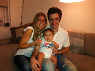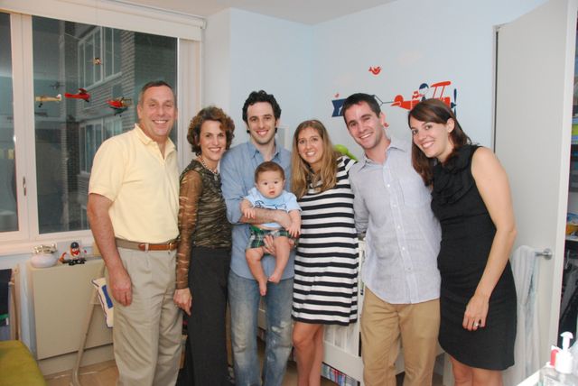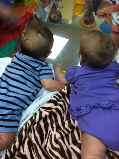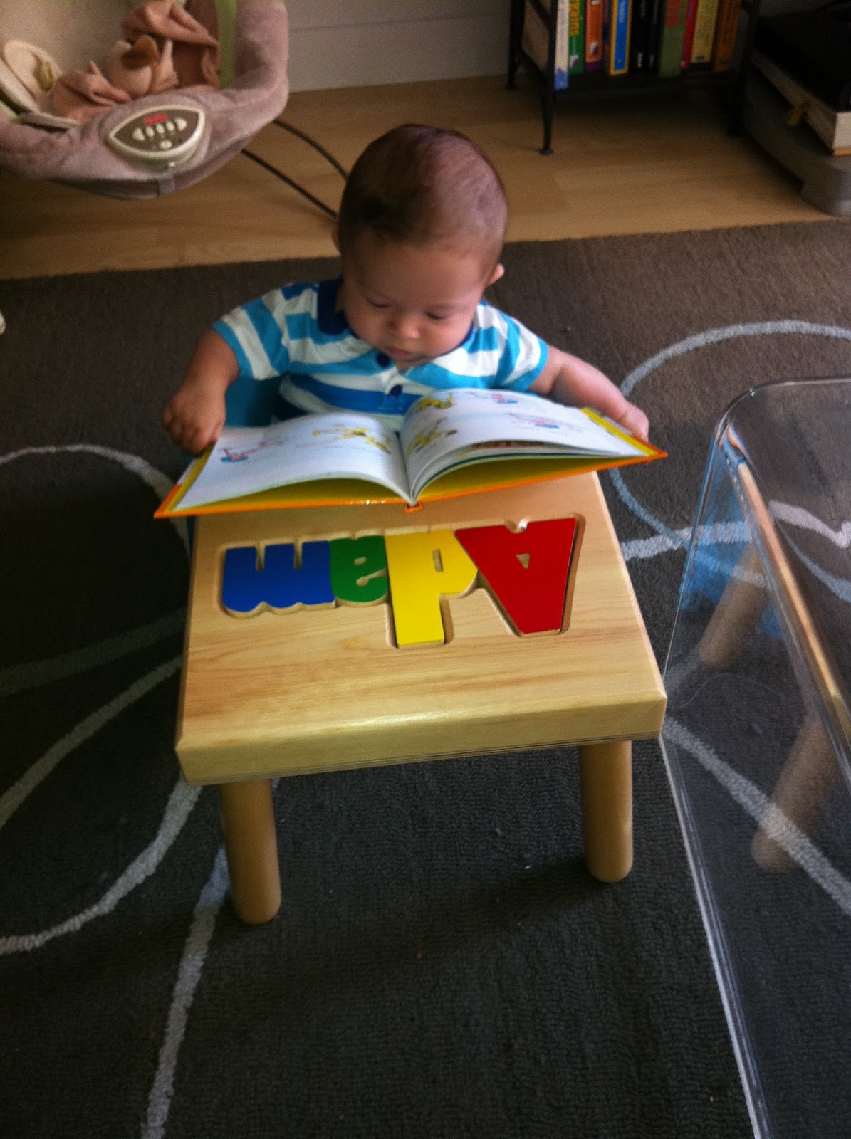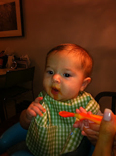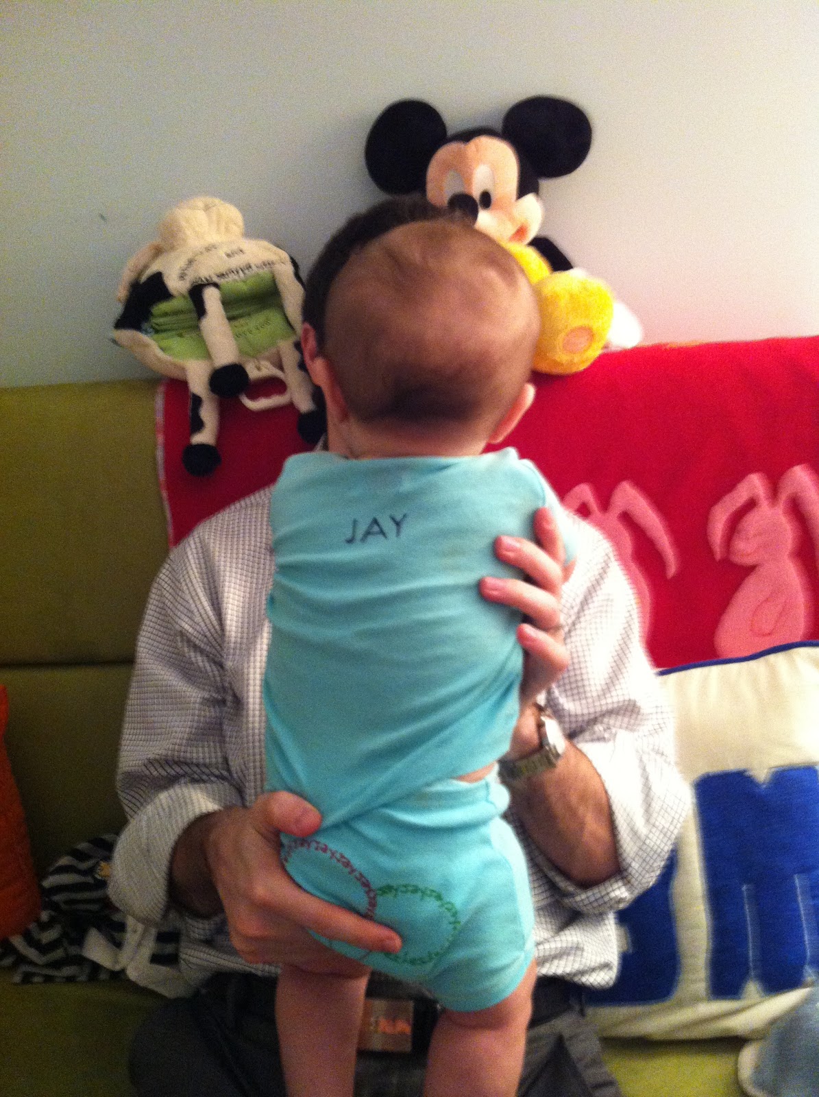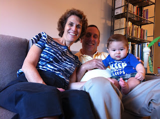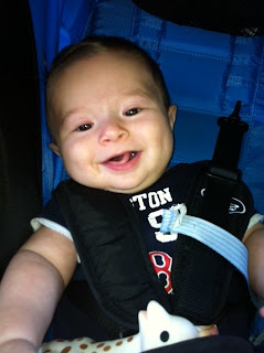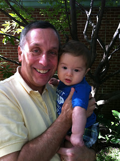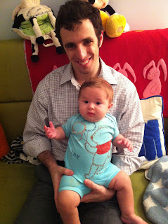 Another accidental color coordinated Bacow photo. My Aunt Julie got me the onesie. It's a little tight because I'm already wearing 12mo clothes now. The stores just can't keep up with this growth spurt that I've been having.