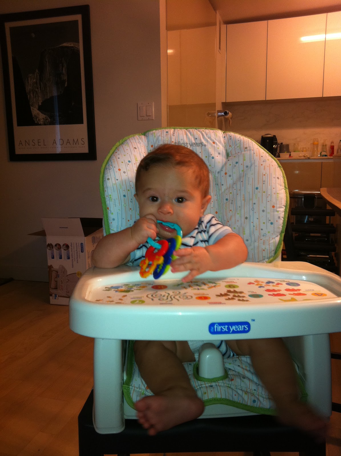Me in my portable high chair. Who needs food when you can munch on toys?