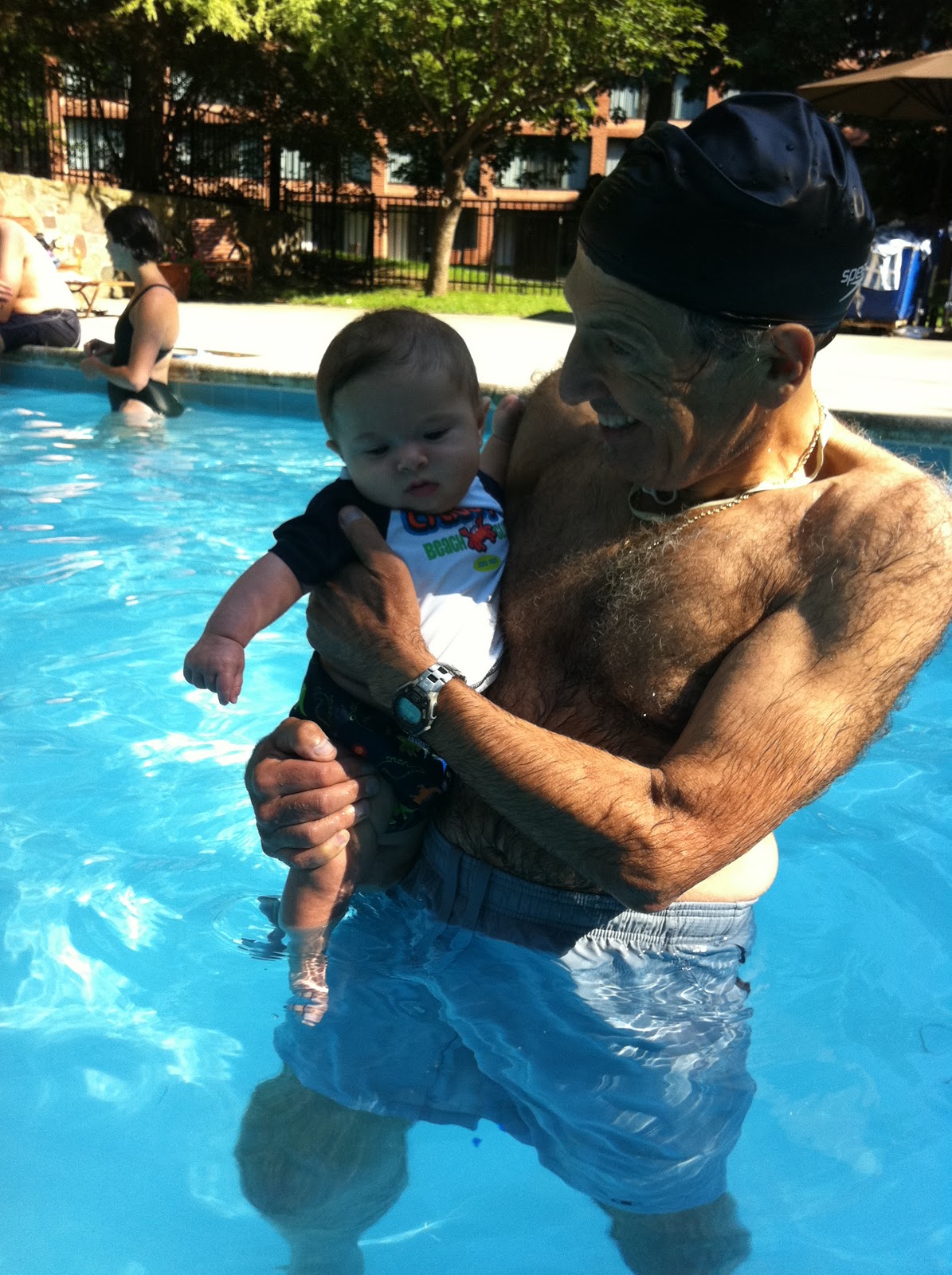 Bathing suit photo #3. Just me and my trunks. As for the dude in the yellow swim cap... er... I don't know him... I think I was adopted...