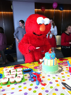 Everything one needs on a hot day: a stroller fan, and Elmo.