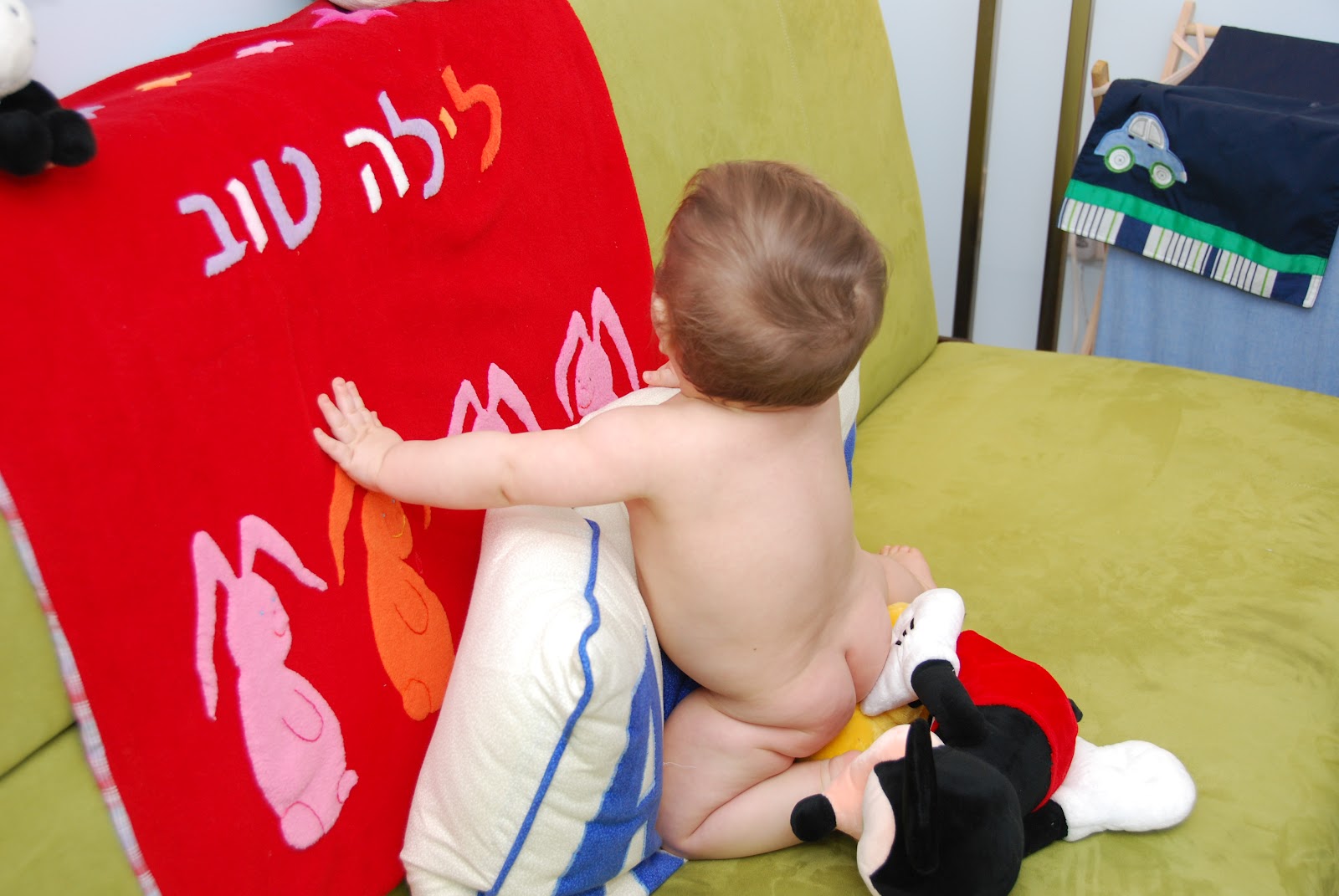 This is the unfortunate incident where mommy forgot diapers and I had to borrow a much smaller one which led to my "diaper thong." It also showed off my farmer's tan, so all was not lost :)